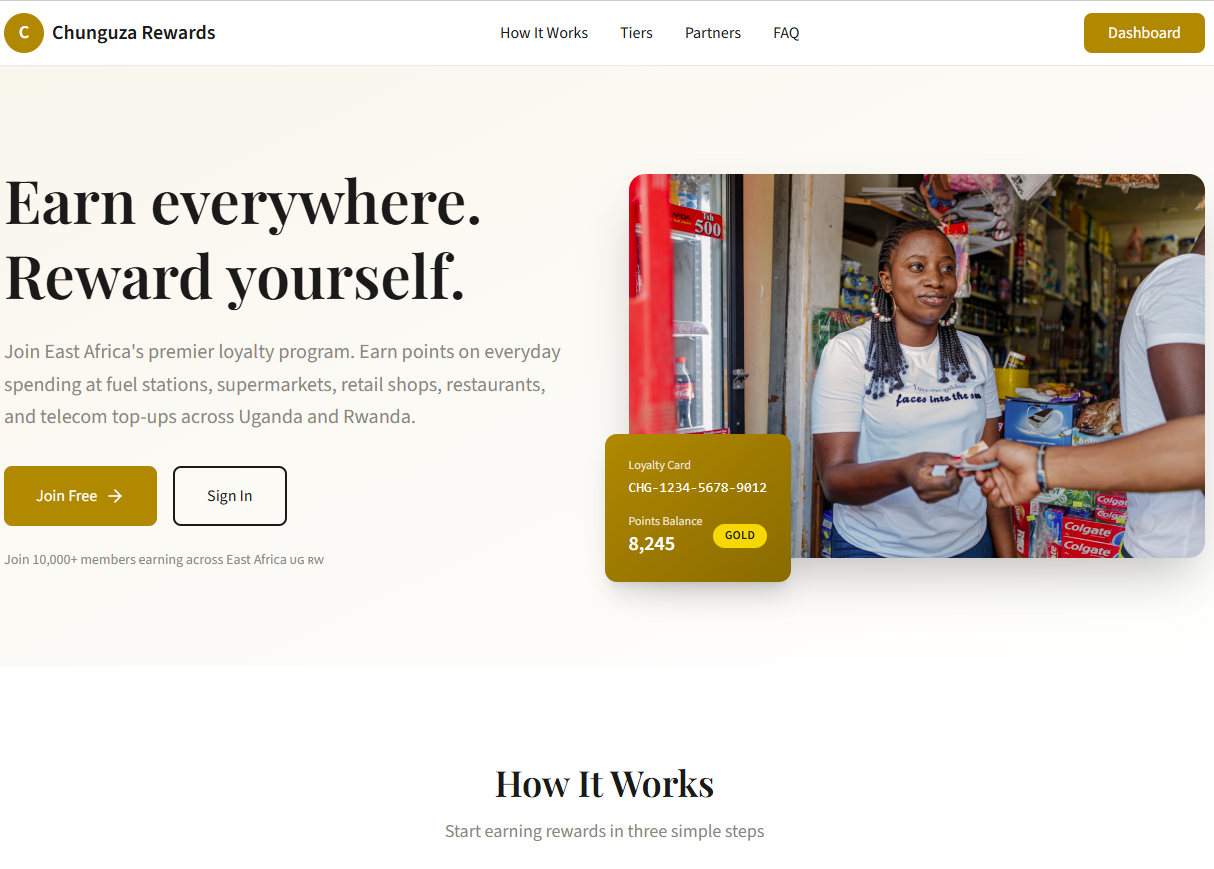 A multi-brand loyalty rewards platform built for East Africa, letting members earn and redeem points across 100+ partner locations — fuel stations, supermarkets, restaurants, retail, and telecoms — across Uganda, Rwanda, and Kenya.